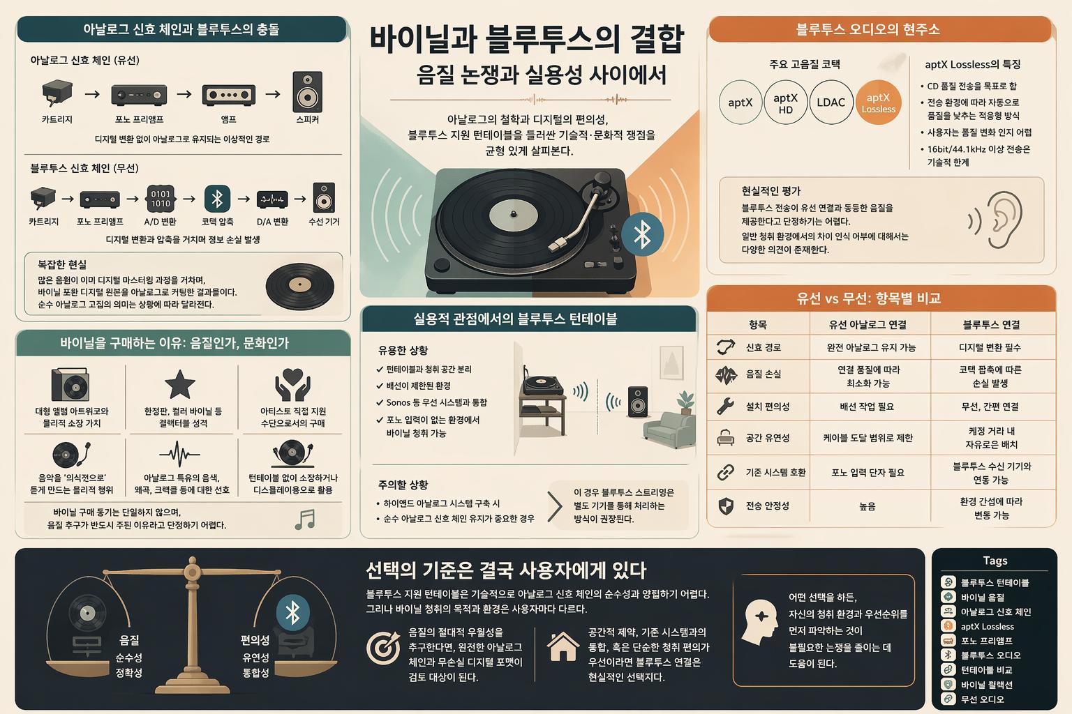 블루투스 턴테이블, 바이닐 음질, 아날로그 신호 체인, aptX Lossless, 포노 프리앰프, 블루투스 오디오, 턴테이블 비교, 바이닐 컬렉션, 무선 오디오