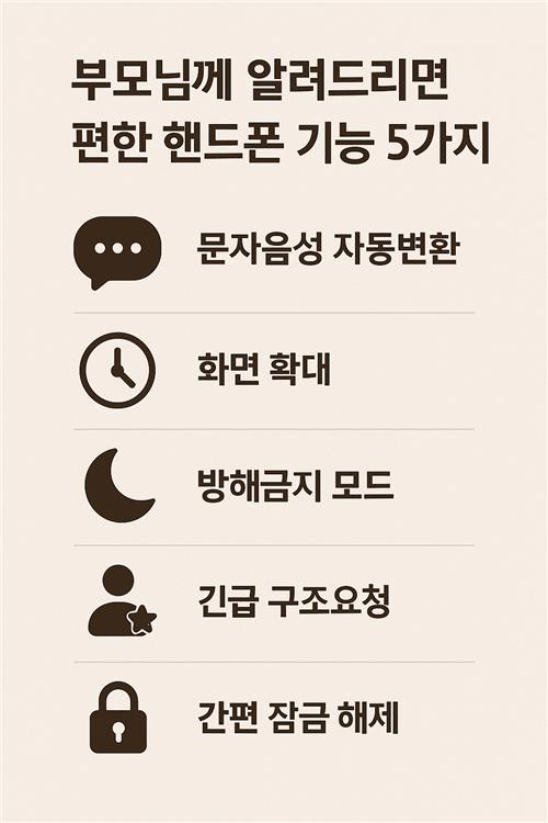 요즘 스마트폰은 정말 똑똑하죠! 그런데 기능이 너무 많다 보니, 부모님 세대에서는 어떤 걸 어떻게 써야 할지 막막해하시곤 해요. 그래서 오늘은 부모님이 사용하면 정말 유용한 핸드폰 기능 5가지를 소개해드릴게요. 자녀분이 한 번만 알려드려도, 생활이 한결 편해질 수 있는 기능들이랍니다 😊