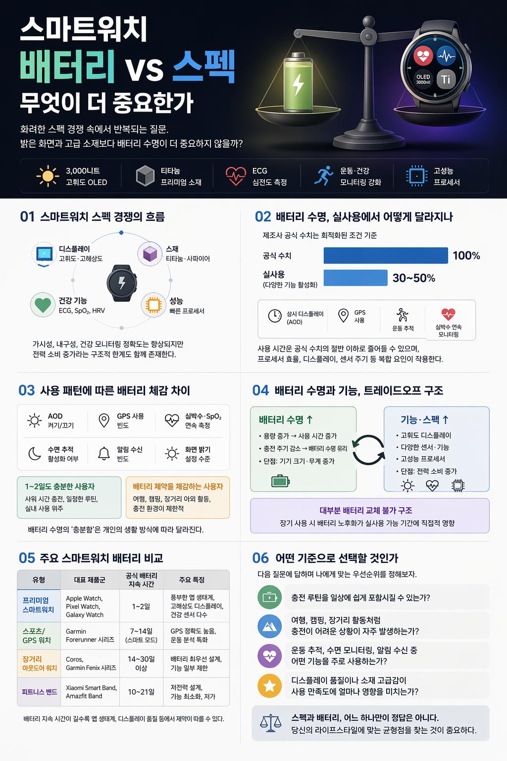 스마트워치 선택에서 배터리 수명과 스펙은 상호 배타적인 요소가 아니다. 다만 현재 기술 수준에서는 두 가지를 동시에 극대화하기 어렵고, 제조사마다 어느 쪽에 무게를 두느냐에 따라 제품 특성이 뚜렷하게 갈린다.