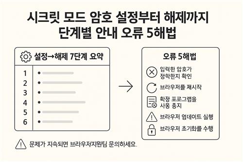 혹시 시크릿 모드를 켜놓은 채로 비밀번호를 설정했는데, 다시 들어가려니 비밀번호가 생각나지 않으셨나요? 또는 갑자기 암호가 먹히지 않아 당황한 적 있으신가요? 이 글에서는 시크릿 모드의 암호 설정부터 해제, 그리고 자주 발생하는 오류 5가지 해결 방법까지 한 번에 안내드립니다.