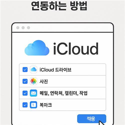 - 연동할 항목 선택사진, 메일, 연락처, 캘린더, iCloud Drive 등 원하는 항목을 체크한 후 ‘적용’을 눌러 설정을 완료합니다.