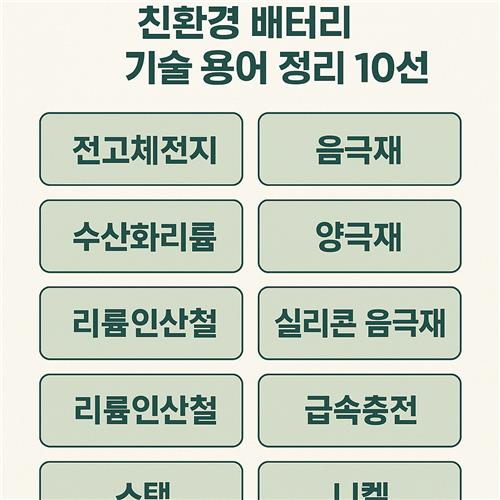 관련 뉴스를 보거나 기술 소개 글을 읽다 보면 리튬, BMS, 전고체 같은 용어들이 쏟아져 나오죠. 그래서 이번 포스팅에서는 친환경 배터리 기술의 핵심 용어 10가지를 정리해 보았어요.