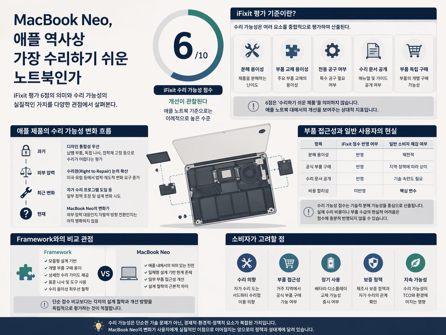 MacBook Neo, 애플 노트북 수리, iFixit 평가, 수리권 Right to Repair, 노트북 수리 가능성, Framework 비교, 애플 부품 교체, 소비자 전자기기 수리, 맥북 자가수리